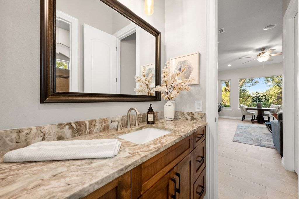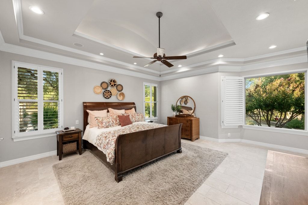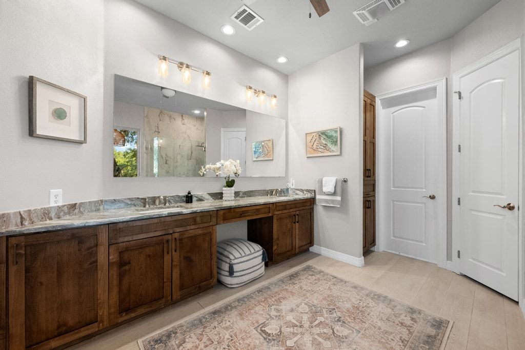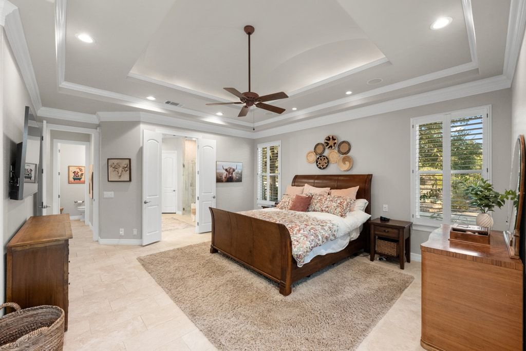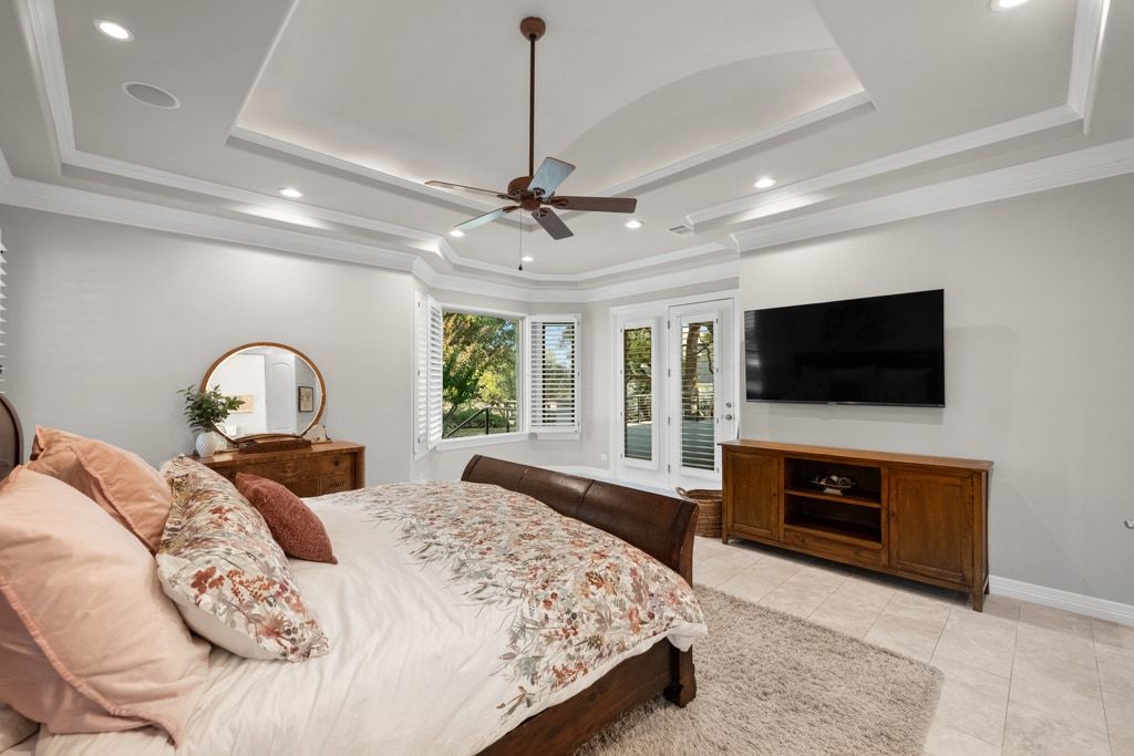The primary suite is a tranquil retreat with tray ceilings, custom lighting, direct patio and pool access, and a luxurious bathroom with a walk-in shower, freestanding tub, and custom walk-in closet. The mother-in-law layout includes two Jack and Jill bathrooms and a spacious rear bedroom, adaptable as a second owner’s suite, home office, media room, or fitness space.