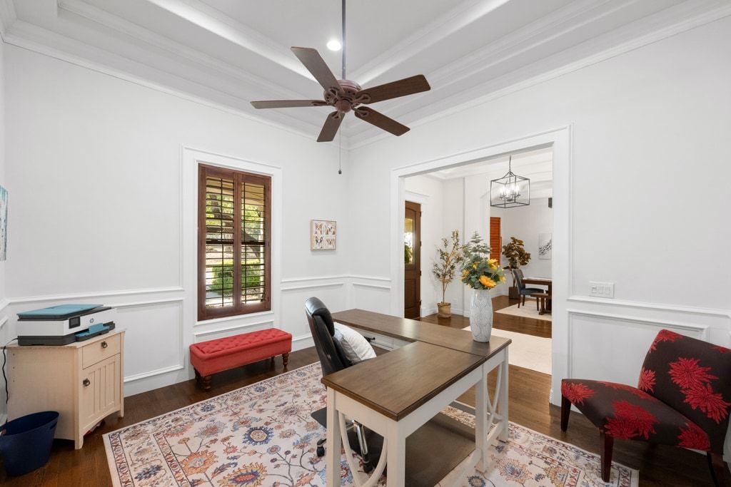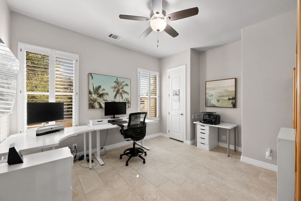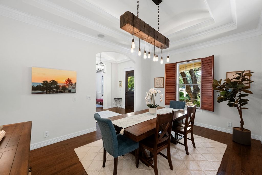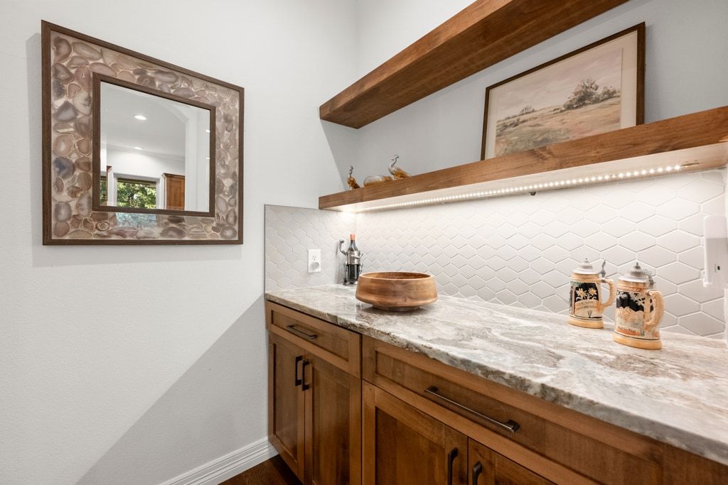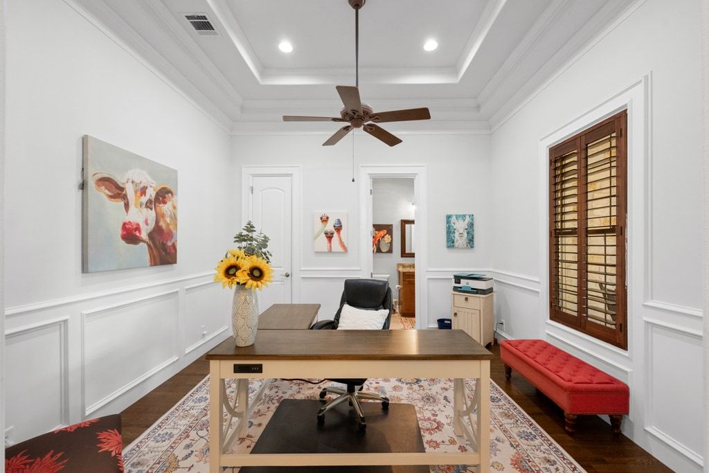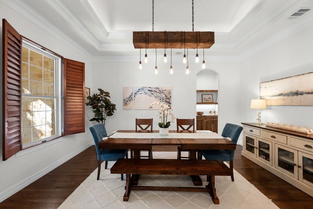 The primary suite is a tranquil retreat with tray ceilings, custom lighting, direct patio and pool access, and a luxurious bathroom with a walk-in shower, freestanding tub, and custom walk-in closet. The mother-in-law layout includes two Jack and Jill bathrooms and a spacious rear bedroom, adaptable as a second owner’s suite, home office, media room, or fitness space.