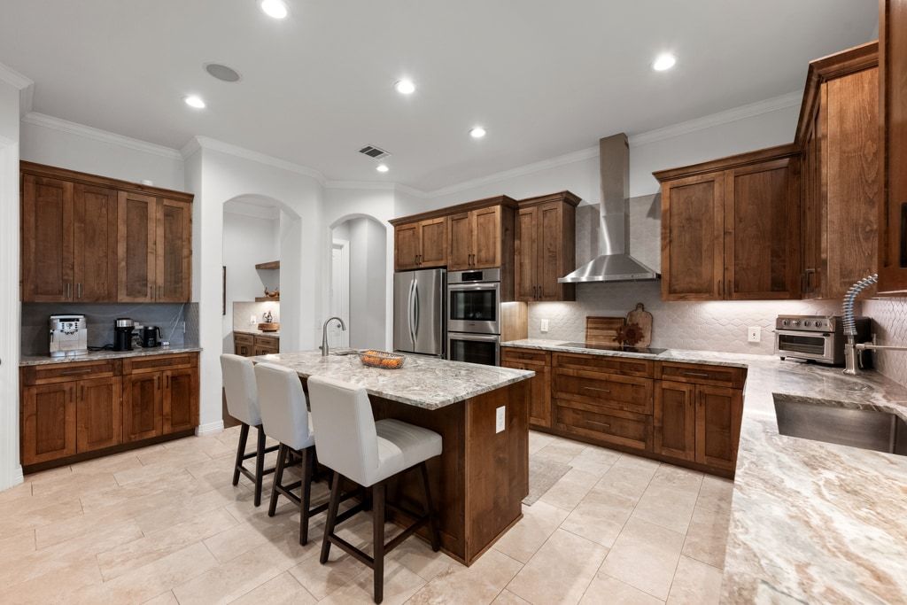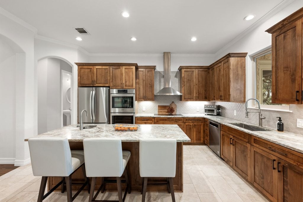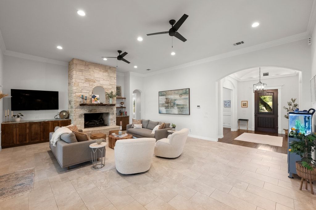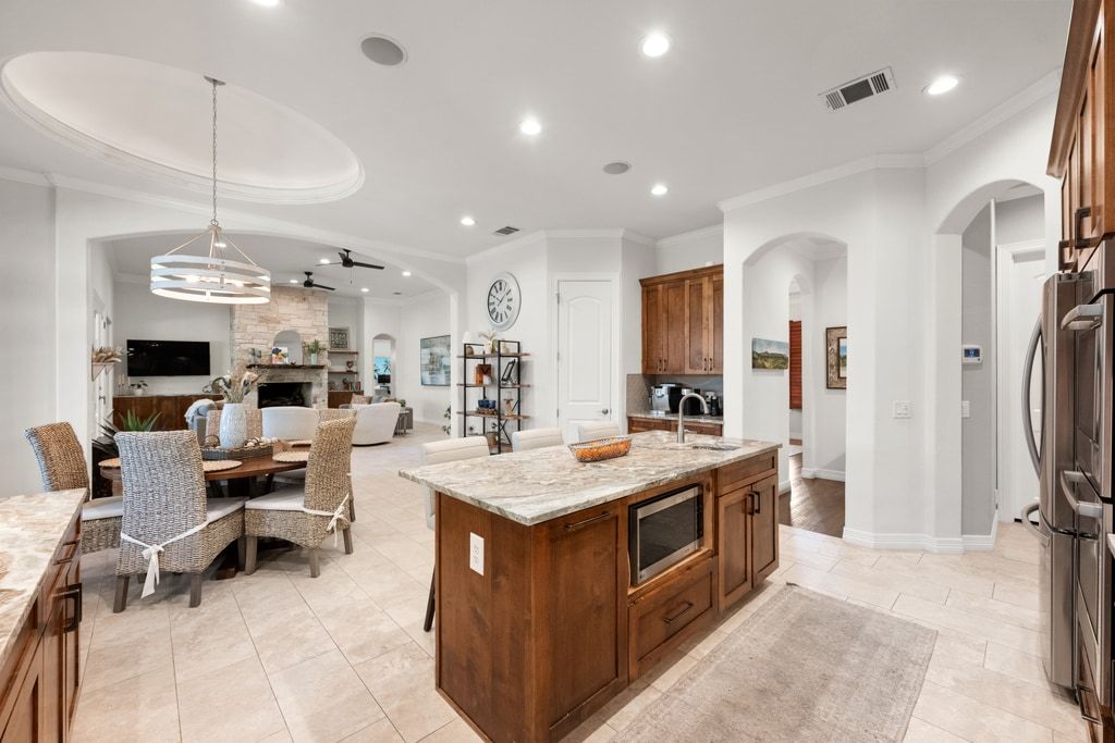 Spanning 3,567 square feet, the open-concept layout is designed for both functionality and sophistication. The family room, featuring a dramatic floor-to-ceiling stone fireplace, serves as the home’s inviting centerpiece. The gourmet kitchen boasts modern Bosch appliances, dual ovens, a spacious granite island, an extra prep sink, and a butler’s pantry. A formal dining room adds a touch of refinement.