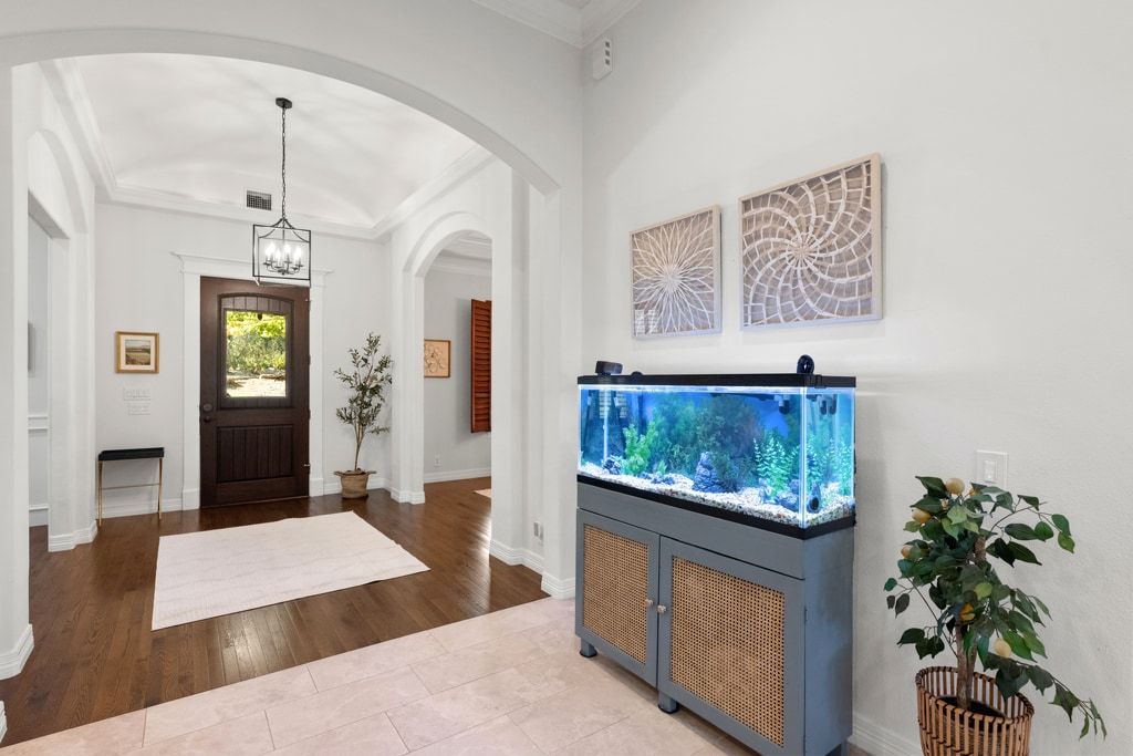 The expansive outdoor space features a heated saltwater pool with an integrated spa, perfect for unwinding. A large fenced yard and a versatile Trex deck—both covered and uncovered—create an ideal setting for relaxation or entertaining. The property also includes an eco-friendly rainwater collection system.